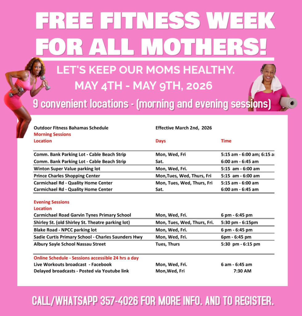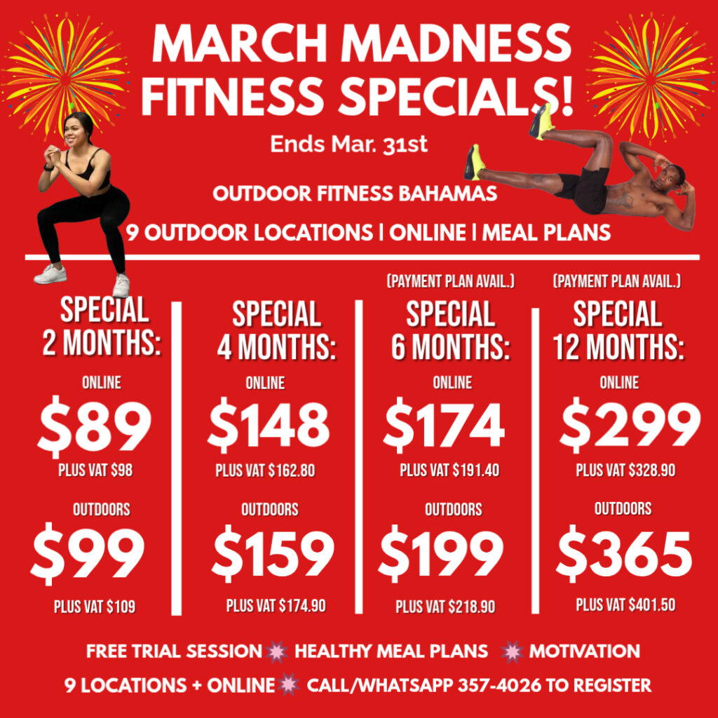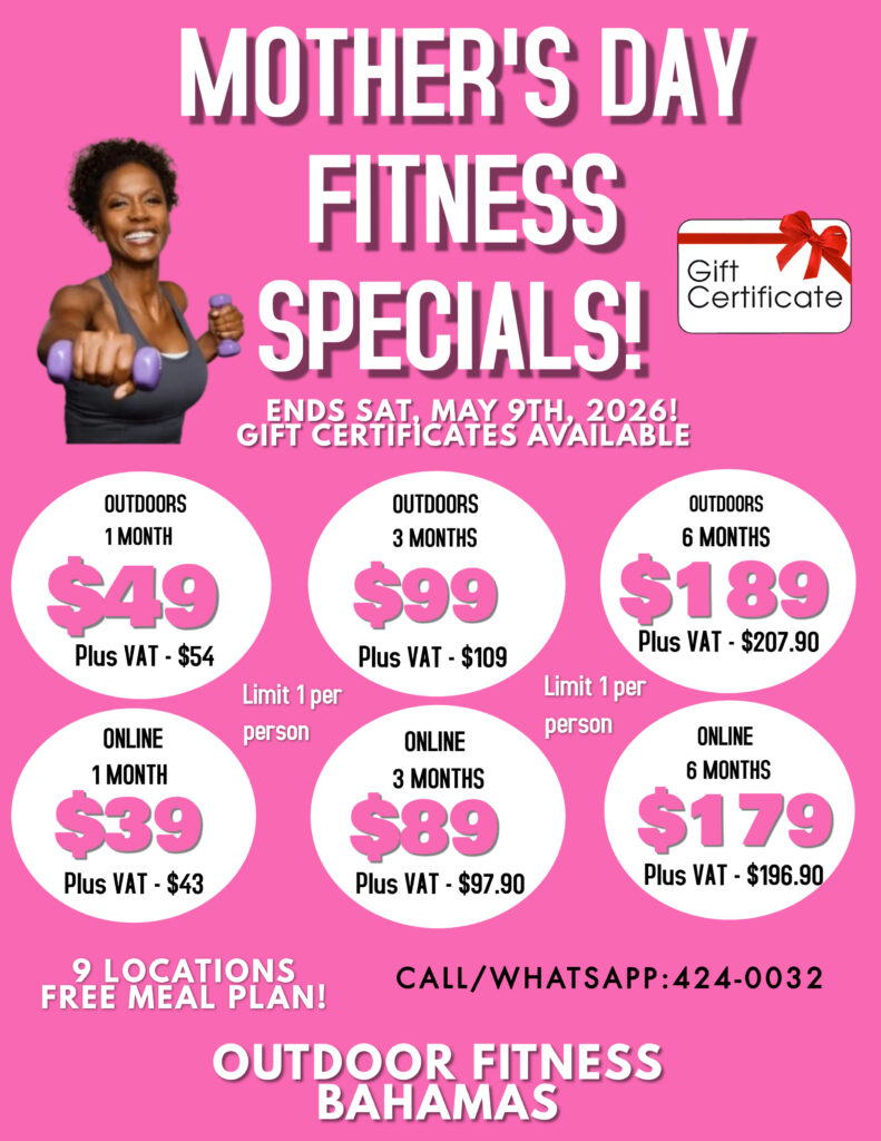 FITNESS ORGANIZATION IN THE BAHAMAS. WE OFFER OVER 50 WEEKLYS SESSIONS IN THE FRESH AIR OUTDOORS AND ONLINE. HUNDREDS OF CLIENTS HAVE LOST WEIGHT, LOWERED THEIR RISK OF DISEASES AND IMPROVED THEIR FITNESS LEVELS BY PARTICIPATING IN OUR AFFORDABLE EXERCISE AND NUTRITION PROGRAMS. AND, THIS IS ALL COMPLIMENTED WITH THE KIND OF SUPPORT AND MOTIVATION YOU WON’T FIND ANYWHERE ELSE. CONTACT US ABOUT A FREE TRIAL AND EXPERIENCE A NEW LEVEL OF FITNESS!!